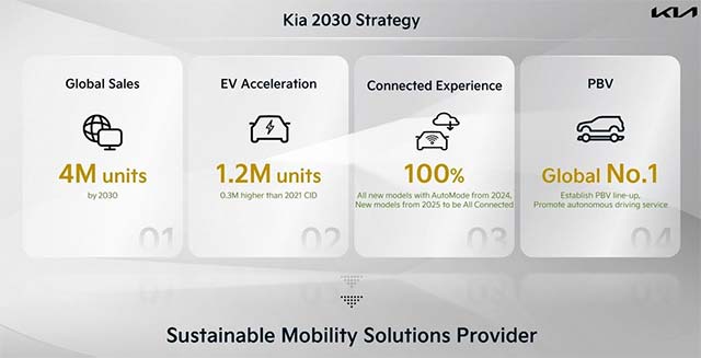 起亚还发布了 2030 年的四项要害事务方针。这些中心事务方针包含:加快电气化,到 2030 年完成 120 万辆纯电动轿车 (BEV) 的年销量;到 2030 年到达 400 万辆轿车年销量,其间包含超越 200 万辆环保车型;将联网轿车功用和自动驾驭技能的使用扩展到一切新车;到 2030 年成为全球专用车(PBV)商场榜首品牌。