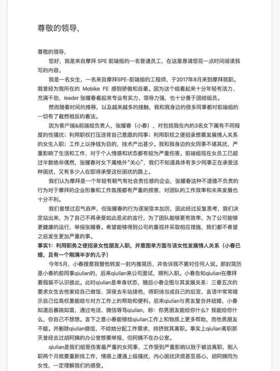 “咱们曾想过人气吞声,但张耀春的行为逐步肆无忌惮,因而通过重复考虑,咱们决议站出来。为了自己不再接受如此恶劣的言行,为了团队可以更有功率,为了公司可以更健康的运转,告发张耀春。期望可以得到公司的注重并采纳相应措施,咱们都不期望之后产生愈加严峻的事。”这位摩拜女职工写道。
