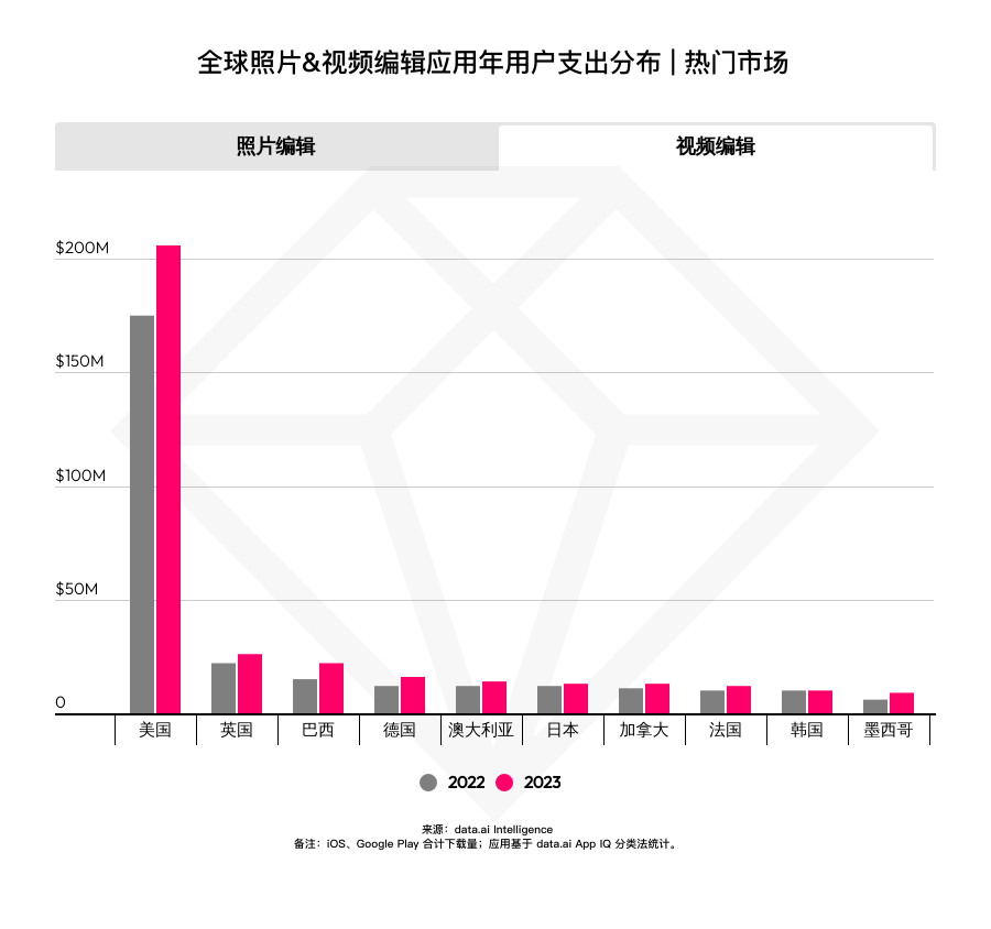 2023 年美国相片修改运用用户开销打破 4.3 亿美元,同比增加 18% ,并占到全球总收入的 42% 。其他抢手商场包含英国、巴西、日本均显现出明显增加。实际上,海外高收入商场 Top 10 同比均有不同程度进步。虽然视频修改运用在美国仅完成约 2.1 亿美元营收,但其同比增加率相同到达了 18% 。除欧美日韩这些老练商场外,以巴西、墨西哥为代表的拉美商场用户开销体现相同亮眼,增加率均超越 40% 。