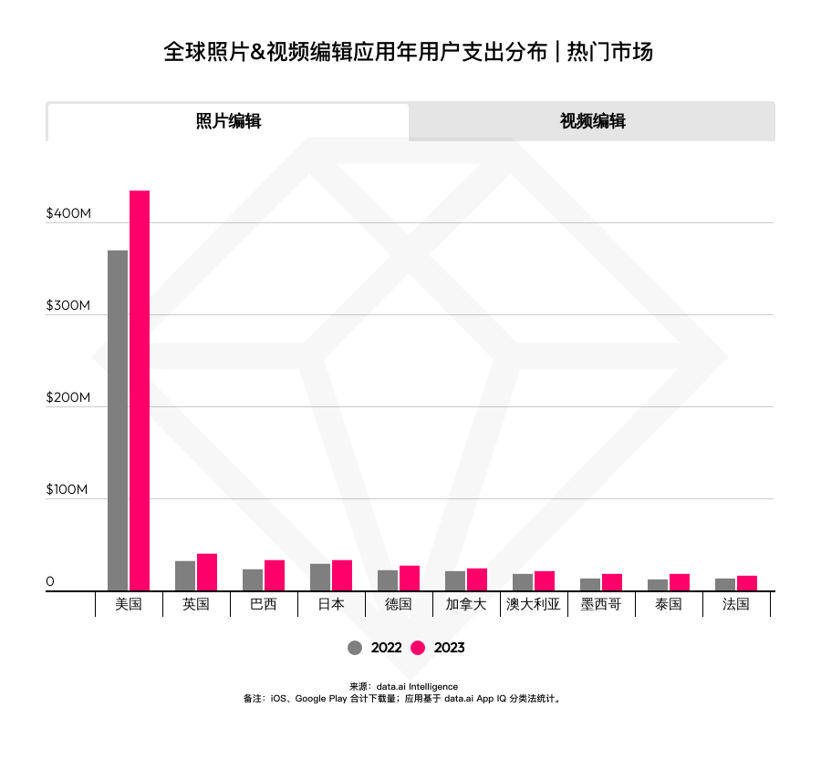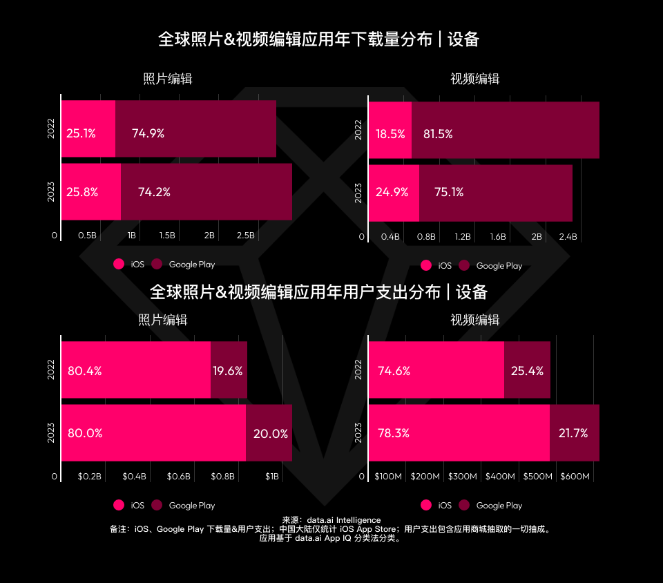 用户开销方面,2023 年相片与视频修改运用收入首要来自 iOS 用户,其比例别离到达 80% 与 78.3%。两者 iOS 与 Google Play 用户开销均出现增加势态,反映出当下巨大的变现潜力。