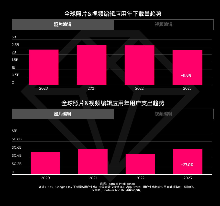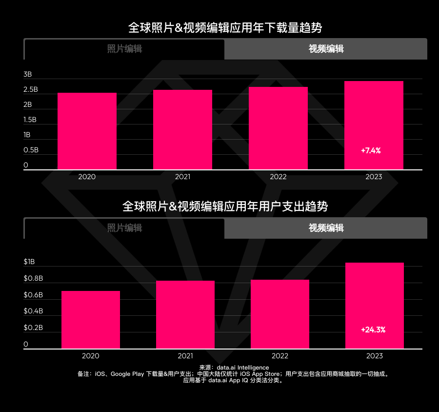依据 data.ai 发布的陈述,2023 年全球相片修改运用下载量到达 29 亿次,创下近年记载。实际上,相片修改运用商场一直在逐年扩张,体现出杰出的开展局势。跟着产品功用的日益丰厚,以及订阅付费的遍及,相片修改运用用户开销体现在 2023 年进一步进步,并打破 10 亿美元,增加率为 24.3% 。