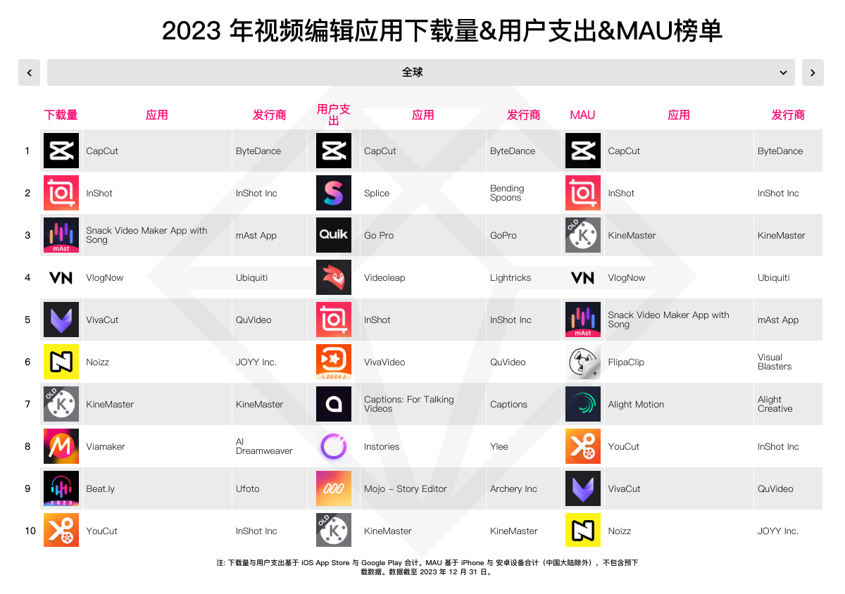 视频修改运用则在 2021 年到达下载量高峰后出现下滑趋势,于 2023 年跌至近 23 亿。未有体现杰出的子类别新产品出现以及头部运用逐步饱满的商场是视频修改运用商场开展滞缓的首要原因。但 2023 年视频修改运用总用户开销到达 6.1 亿美元,同比增加 27% ,与 2021 年相等,该商场仍旧有利可图。