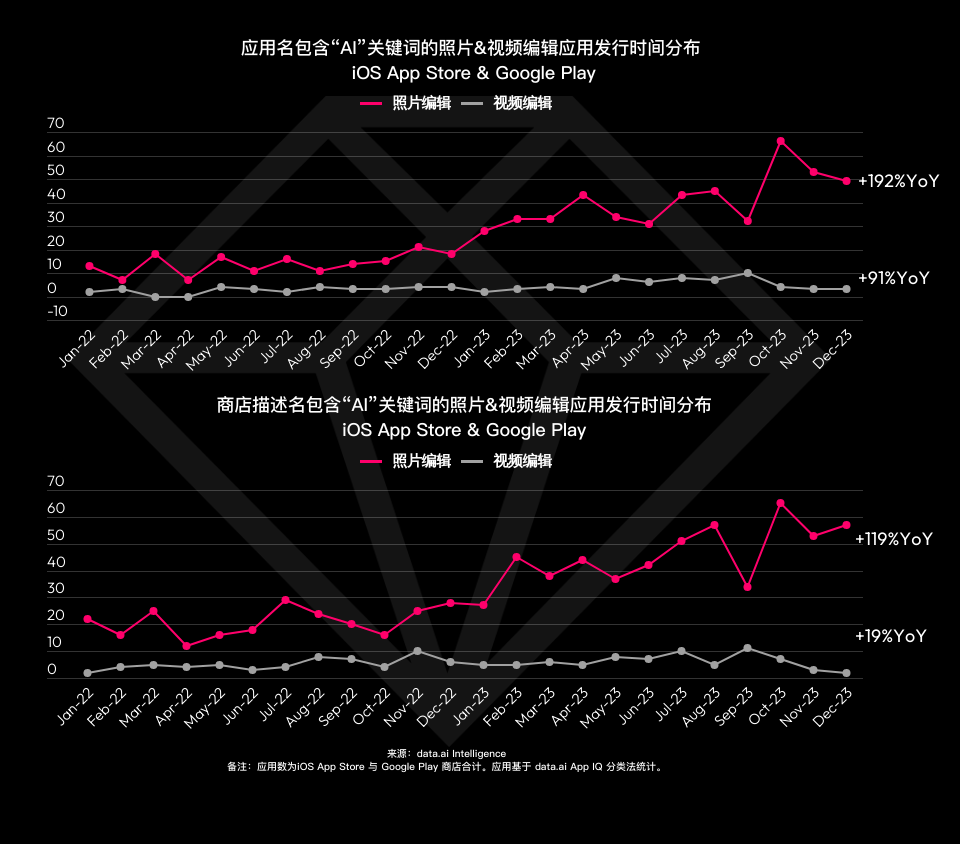 跟着 OpenAI 发布 ChatGPT 并带动AIGC技能进一步成为抢手,与之相关的移动运用在 2023 年呈爆发式增加。这一趋势在移动相片与视频修改范畴也能看出端倪。2023 年直接在运用名中包含“AI”关键词的新发行相片修改运用超越 490 款,同比增加 192% ,而新发行视频修改运用增加率虽较低,但也到达 91% 。而在商铺描绘中包含“AI”关键词的新发行相片修改运用更是高达 550 款,这也阐明 AIGC 在相片修改运用中的运用场景已逐步丰厚起来。