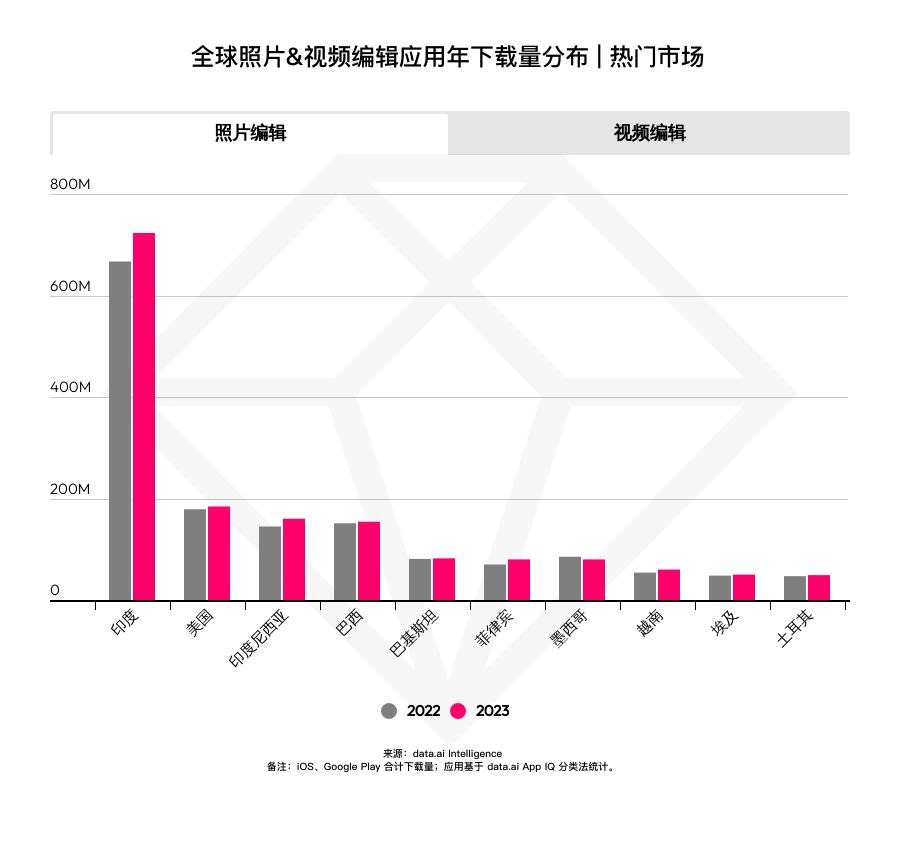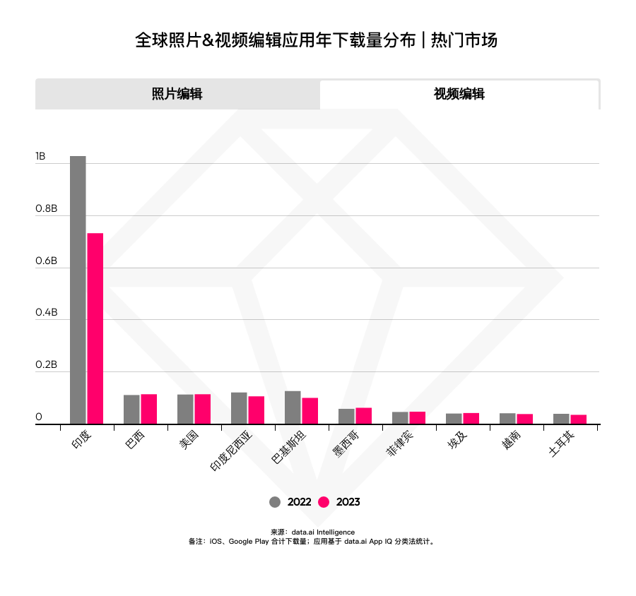 印度仍旧是相片与视频修改运用最大商场,2023 年下载量别离打破 7.2 亿、7.3 亿。不同的是,相片修改运用出现增加趋势,而视频修改运用同比则略有下滑。除美国以外,相片与视频修改运用首要增量商场会集在东南亚、拉美以及中东商场。其间相片修改运用增加体现更为杰出,菲律宾、越南以及德国商场下载量增加率均超越 10% (依次为 14%、12% 和 18%)。