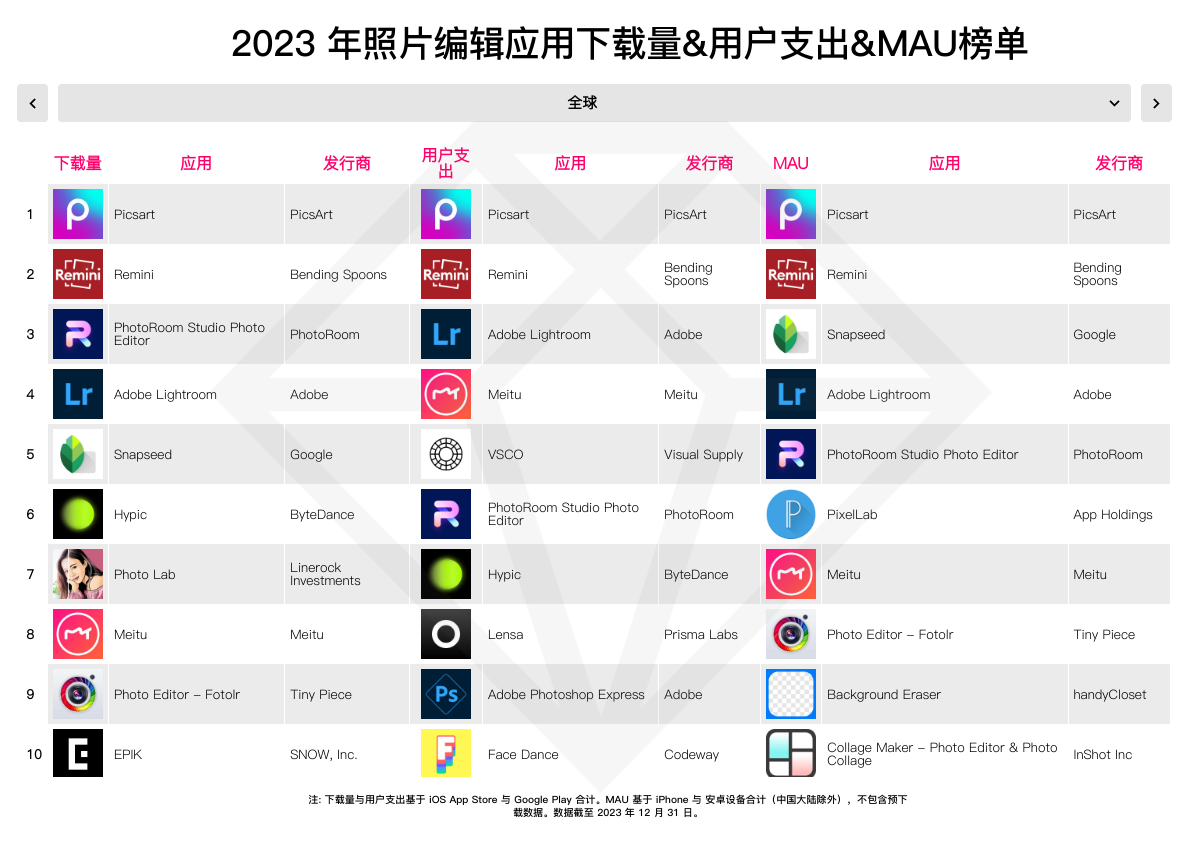 2023 年,相片修改运用 Picsart 无论是在下载量、收入仍是用户活泼均身先士卒。事实上,这款运用在 2023 年已取得超越 1.5 亿全球下载量,用户开销则是到达 1 亿美元,并在德国、法国、阿联酋等多个商场占有下载量和热销榜榜首。而在美国、英国、巴西等商场,Remini 后发先至,成为下载量最高的相片修改运用。Remini 在 2023 年中,凭仗 AI 工作照营销快速翻开商场。到 2023 年,该运用已累计取得 3.34 亿下载和 1.26 亿美元用户开销。